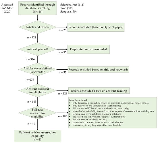 In this study, an attempt was made to review the publications in the literature, detecting the most common GST-based methods as applied to various fields of sustainability studies. To investigate the impact of GST methods as used in the sub-fields of sustainability, a four-phase study was conducted in the light of the literature: (a) Search and select the relevant publications; (b) revisit the publications selected; (c) include or exclude the publications with a full-text through an evaluation; and (d) re-inspect 40 publications meeting the inclusion criteria thoroughly and meticulously.