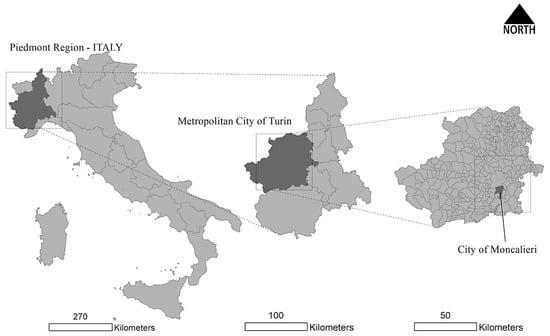 The City of Moncalieri (IT) -represented geographically in Figure 1- directly south from the City of Turin, is part of the Metropolitan area of Turin (north-west Italy). It is located in the western part of the Po Valley at 260 m a.s.l. of altitude, surrounded by the Alps crown, and with a continental, temperate climate (Italian climate zone E). The orography is quite heterogeneous with flat fluvial areas in the southern and western sectors, while in the north-east the hills shape the landscape with its natural areas mixed with a typical sprawled settlement system (detached and semi-detached single-family houses). The municipality has a population of 57.527 inhabitants (last updated on 31 December 2019, ISTAT) [41], and consists of about 6.200 buildings [42,43].