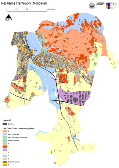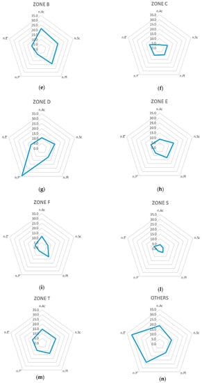To simplify the large collection of land use zones and represent it in a map (Figure 2). We have selected the nine macro-categories, and the four specific land uses over-mentioned: Three A areas, four B areas, four C areas, two D areas, three T areas, four E areas, four S areas, ten F areas, and four so-called “other zones”.