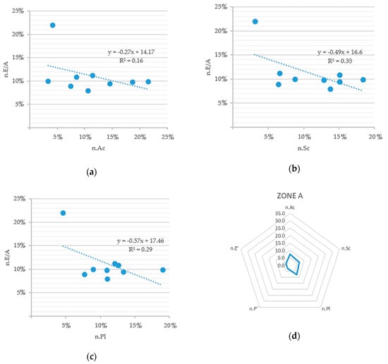 (a) regression analysis between n.E/A and n.Ac; (b) regression analysis between n.E/A and n.Sc; (c) regression analysis between n.E/A and n.Pl; (d–n) Radar chart of the comparative analysis between compactness indicators and the energy indicator in different normative zones; n.Ac is the normalized absolute compactness, n.Sc is the normalized site coverage, n.Pl is the normalized plot ration, n.P¯ is the normalized regulatory minimum for renewable energy production, and n.E/A is the normalized solar energy production potential for the unit of building roof area in each zone. (All values are percentages).