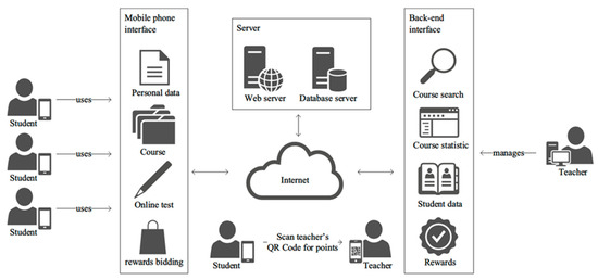 This study proposed combining MAPS of educational concepts and APP (Application) development to enhance students’ interest in learning. To provide teachers with an innovative new teaching tool, the study employed low-cost and popular QR Codes as a vehicle in building an innovative teaching model with an answer points and bidding system. The system architecture is shown in Figure 2. Adopting cloud application, the study provided students and teachers, through the Internet service, with the software and hardware developed based on the actual needs to stimulate students’ enthusiasm for learning and students’ behaviors for reflective learning.
