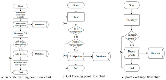 Students can take a test after installing the app. By passing the test, they earn learning points. In addition, teachers can use the Hash Function to generate a QR Code for one-time learning points as an incentive for students to actively participate. Students redeem points to do competitive bidding for prizes. Students first enter the learning points they want to bid for a prize. If the points are above a minimum amount of points that is used to exchange rewards, and exceed bids by other students, they can successfully redeem the prize. The process of earning and redeeming learning points is shown in Figure 4.