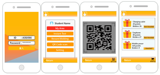 The mobile phone interface design includes the Student Interface, the Teacher Interface, and the Management Interface. After students log into the system, they can choose “My Area”, “Instant test”, “Reward Bidding”, “Scan QR Code” or “Setting”. In “My Area”, students can view course-related information. In “Instant test”, students can receive tests from teachers. In “Reward Bidding”, students can redeem prizes by bidding more learning points than other students. Lastly, when teachers want to encourage the student to focus on the class, teachers can generate a QR Code and allow students to scan the QR Code to obtain learning points. The mobile phone interface design on the Student Interface is shown in Figure 5. The functions of the Teacher and Management Interfaces include uploading test items, gathering statistics of student data, uploading pictures of reward items, reviewing the numerical range of test results, and exporting it into a grade report.