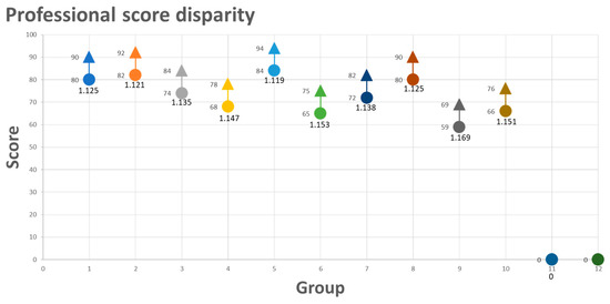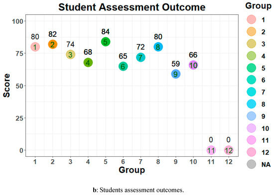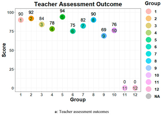 A total of 37 college students participated in the study. The participants were divided into 12 groups in a mobile phone programming course. The details of peer assessment and the teacher’s professional assessment are shown in Figure 6. The student peer assessment and teacher score results are shown in color-coded point diagrams, marking the group numbers and group scores received, respectively. The differences displayed in Figure 6 were used to observe whether student peer assessment results aligned with the teacher’s professional score criteria or demonstrated significant disparity. Figure 6 shows the distribution of various student groups and teacher scores.