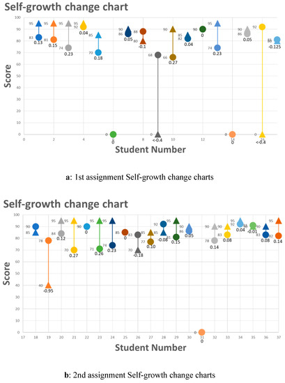 Figure 8 shows the learning status of the respective students. In the figure, a dot represents the scores of the first assignment and a triangle represents the scores of the second assignment. The vertical axis represents the score value achieved for the assignment, and the horizonal axis represents the value change of students’ professional self-growth. It can be observed that most students made progress in the second assignment; however, it also shows that three students showed significant declines (<−0.4).