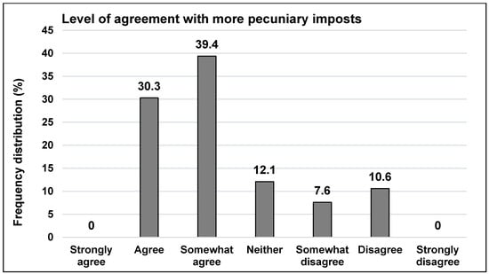 For the first category, the responses showed that the respondents significantly favoured market incentives (Figure 1), with more than 92% indicating agreement or somewhat agreement. The more pecuniary approach received significant but comparatively less support; the results showed that about 70% of participants indicated agreement with implementing more pecuniary imposts given enforcement activities status quo (Figure 2).