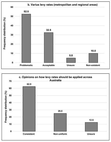Cost disparity in levy rate also exists between Australian states. The participants were asked to indicate their opinion about this cost disparity. The results showed an overwhelming majority of responses (62.5%) supported having a national consistent levy rate (Figure 4c). About a quarter of responses supported non-uniform levy rates.