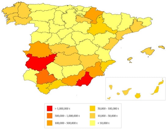 Tomatoes are a crop that originated in Mexico and was brought to Europe by Spaniards in the 16th century. Currently, tomatoes are one of the most consumed vegetables in the world, as they can be eaten fresh or following a wide variety of forms of processing [11]. In fact, worldwide tomato production increases every year, reaching 182.3 million tonnes in 2017 (the economic data in this section refers to 2017, the last year with available data). China is the main producer, followed by India, with both accounting for 44% of the worldwide production. Spain, with a production of 5.2 million tonnes, ranks eighth in the world, and second on a European level behind Italy [12]. The production of fresh tomatoes in Spain is concentrated in the southeast of the country, specifically in the provinces of Almería and Murcia, with 1,008,867 and 228,780 tonnes, respectively. Production in the Community of Extremadura is also noteworthy, although a majority of its produce is destined for the canning industry (Figure 1) [8,13].