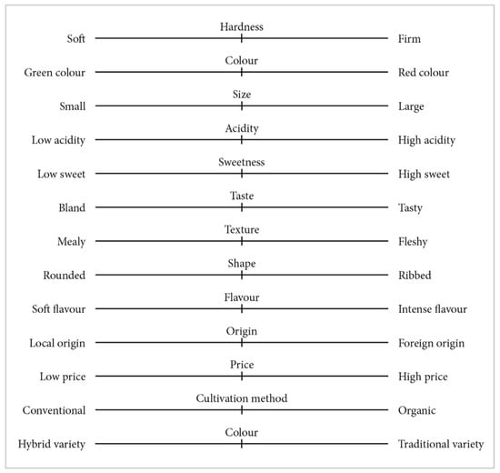 As well as the choice experiment, the questionnaire included a question where participants had to reveal their purchase preferences regarding a series of tomato attributes. This was conducted by way of a semantic differential scale (Figure 2).