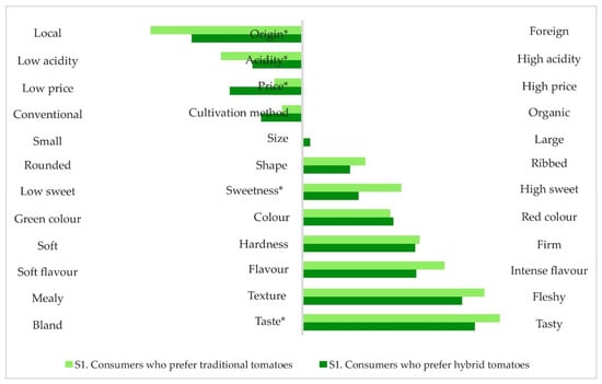 Regarding the attribute levels, S1 especially values that tomatoes are of a local origin and tasty (high sweetness and low acidity). The origin of the product is an appealing quality for this sector of the population, as supporting the local economy by purchasing products from the region makes them feel good [53]. On the other hand, S2 stands out because of the importance it gives prices compared to S1 (Figure 4).