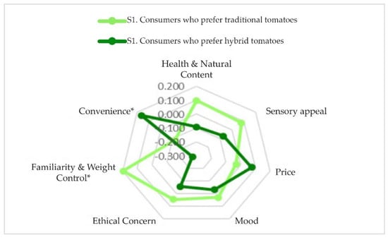 The analysis of the results obtained for these factors in both segments shows that in two factors there are significant differences among segments (Figure 5). On the one hand, S1 values much more positively “familiarity,” whereas they disregard “convenience.” In Spain, the consumption of traditional foods is driven by familiarity, naturalness, and the general attitude towards those types of foods [54]. On the other hand, S2 gives great importance to “convenience” and negatively qualify the “familiarity” factor.