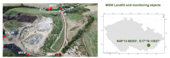 The MSW landfill in Zdounky (N49°13.66253′, E17°19.13927′), which is operated by the company DEPOZ Ltd. residing in Zdounky 27 (Figure 1), receives more than 10 Mg of waste daily, and its total capacity is over 25,000 Mg. The waste comes from agricultural production, gardening, forestry, game management, fisheries (waste plastic materials), waste from fruit processing, textile industry waste, waste from power plants and other combustion facilities, waste from the production of earthenware and bricks, packaging, concrete, bricks, roof tiles, earth, asphalt mixtures, and waste from wastewater treatment plants, etc. The total landfill area is 69,500 m2, the total volume of deposited waste is 992,800 m3 and the total amount of deposited waste is 1,280,750 Mg.