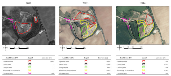 Changes in the use of the respective landfill parts in the period of 14 years (2000–2014). The surface area of the respective parts of the landfill was determined based on the analysis of aerial photographs made by the Czech Office for Surveying, Mapping and Cadaster.