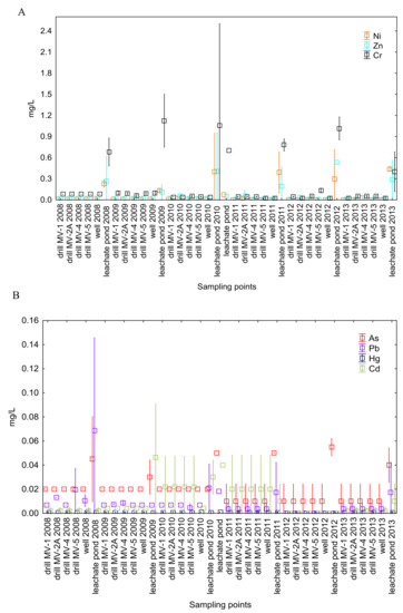The content of HMs in groundwater and leachate can be evaluated from several perspectives both as the mean values for individual years (Figure 3) and as the mean values for the whole period of monitoring (2008–2013) (Figure 4A,B). The measured values revealed several results. Firstly, more profound concentrations of HMs (Figure 3A) were found only in Ni, Zn and Cr, with the values regularly exceeding the limit of 0.1 mg L−1, which could be considered significant with respect to the sensitivity of methods used. Other HMs such as, Pb, Hg and Cd (Figure 3B) were most of the time present in very low concentrations < 0.07 mg L−1. Secondly, no significant differences (P < 0.05) were observed among the respective monitoring drill holes (Figure 4), only between all drill holes and the LP. Thirdly, neither the date nor the year of sampling had a significant influence on the concentrations of the selected HMs in the samples. This was also corroborated by the ANOVA results (Appendix A Table A1 and Table A2) which did not indicate any significant differences. The measured values showed only partial differences between the individual drill holes and the well. By contrast, the concentration of HMs measured in the LP reached demonstrably (P < 0.05) the highest values.