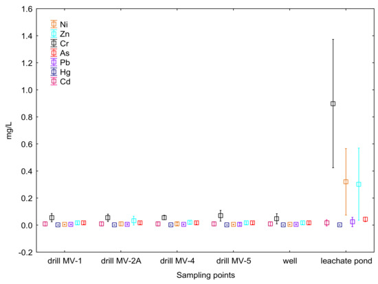 The below comparison with the World Health Organization (WHO) limits (2011 and 2017) [32,33] in Table 3 shows clearly that the measured Ni, Zn and Cr concentrations were higher in the LP when compared with those in the drill holes and in the shaft ring well. These increased HMs concentrations in the measuring point of LP demonstrate that the mechanisms preventing HMs leaks from the landfill into the surrounding environment function properly. The most important measure is seen in the landfill insulation layer, which prevents HMs leakage into groundwater. The LP water exhibited the highest concentrations of Ni, Zn and Cr (ranging from 0.3 to 0.9 mg L-1) in the respective years of monitoring (Figure 3; 2008–2013) as well as average concentrations of HMs for the whole monitoring period (Figure 4; 2008–2013).