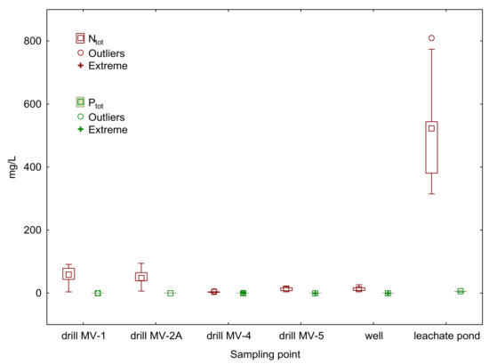 The analyzed relationships between the individual parameters suggest that a positive correlation existed between the content of organic substances (Ptot and Ntot) in the analyzed samples and the concentrations of most HMs (Cd, Zn, Cr, Pb, Ni, As). A similar positive correlation was observed between the COD, PAH, AOX and HMs. The given parameters, Ptot, Ntot and COD in particular, directly indicated the presence of organic substances in water [38,39]. The results from the LP indicate that, in addition to mineral substances, the landfill body also contained substances of organic nature to which HMs may potentially bind that subsequently can be washed out [47]. However, the increased values (particularly those of Ntot and COD) were measured only in the LP. In the monitoring objects, the values of these parameters ranged at very low levels (Figure 6). Hence, there was no groundwater contamination, nor any leakage of hazardous substances into the surrounding farmlands.