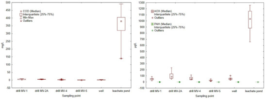 The AOX and PAH contents were monitored, too (Figure 6). The AOX parameter indicates the content of organic substances binding some elements from the group of halogens. These substances are potentially toxic, especially for aquatic ecosystems [35,40]. A description of their impact on human health is complicated because AOX represents a wide group of substances with diverse impacts [41]. The average values measured in all drill holes and in the well did not exceed 60 µg L−1. The values measured in the respective monitoring objects (with the exception of LP) ranged from a minimum of 8.5 to a maximum of 232 µg L−1 with no statistically significant differences among the monitoring objects. There was no evidence that the values would be directly affected by waste landfilling. The substances of the AOX group can be generated naturally, too, for instance by enzymes produced by microorganisms [42].