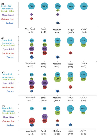 Housing type based on farm size for (A) nursery [n = 43], (B) growing [n = 39], (C) finishing [n = 52], and (D) breeding [n = 40] facilities. Note: sample number [n=] of each animal stage does not equal values presented in Table S3, as not all facilities provided facility type information.