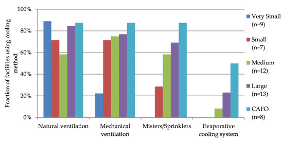 Ventilation and cooling system percentage by farm size. Note: combined sample number, n = 49, is below 69 as not all facilities responded to question.