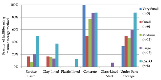 Manure storage was present at 65% of farms surveyed, where larger operations had a higher frequency of farms with manure storage, Table S4. The most common manure storage was a concrete basin (80%), Figure 4. Additionally, 58% of facilities reported having under barn storage, which was more frequent at larger operations. Only 38% of facilities with manure storages utilized storage covers, Table S4. Overall, 78% of facilities with manure storage conducted annual inspections of manure storage, with it being most common for CAFO facilities.