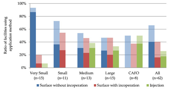 Manure application by farm size. Entire bar (solid plus light shading) represents fraction of facilities using the method to some extent where the solid bar represents the fraction of farms using that application method exclusively. Note: Combined sample number, n = 62, is below 69 as not all facilities responded to question.