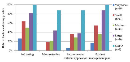 Nutrient management planning is the tracking and management of nutrients throughout a farm [35]. The general idea is to account for all the sources of nutrients on a farm and then manage the nutrients during application to increase crop yields and reduce losses to the environment, particularly to reduce edge of field losses which can then move to surface water. There are many practices that can be adapted to aid in proper nutrient application including soil and manure sampling and analysis, using recommended application rates, and having and following a written nutrient management plan. Permitted CAFO facilities in WI are required to follow all these practices [35], thus it is concerning that some CAFO facilities did not report using these practices, Figure 6. Overall, there was low participation in these practices among respondents compared to other impact categories investigated, highlighting a need for further development and potentially incentivizing practices. Particularly it should be noted that large, medium, small, and very small facilities should be encouraged to increase soil and manure testing, and follow recommended nutrient application rates following guidelines, such as A2809 [41].