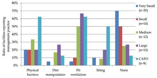 Odors associated with pork facilities are one of the most common neighbor relationship issues. Larger farms reported higher implementation rates of odor reduction strategies, likely because of the larger odor production potential at these facilities. Additionally, as operation size increased, the number of practices implemented at a facility tended to increase as well. It was expected that facilities with neighbors closer in distance would have more odor reduction practices, but distance and number of practices do not appear to be correlated. Pit ventilation was more common with larger farms likely due to the fact they had a higher ratio of under barn storages. Pit ventilation reduces manure gases and odor from being drawn into the animal area. Under barn storage has been shown to reduce odor emissions since it typically minimizes wind exposure to the atmosphere and reduces manure surface area, which reduce emissions. Odor emissions from other types of storage will vary based on surface area of the manure storage, with lower surface area decreasing odor emissions. Venting outside using pit ventilation allows manure gases and odors to dissipate which reduces odor, particularly when wind can increase the dissipation. Ideally odors are vented with a chimney to better dissipate the gases higher into the atmosphere away from receptors (or people) [23,24], but only two facilities reported using chimneys, Table S8. Using physical barriers reduces odors by capturing some of the compounds within the vegetation and dispersing gases up into the atmosphere [25]. Barriers are most easily implemented along property lines to reduce the transport of odor off the property to neighbors, or around odor sources such as animal facilities and manure storage. Only 27% of facilities reported using physical barriers, Figure 7, and could easily be implemented at all facilities to reduce odor impacts.