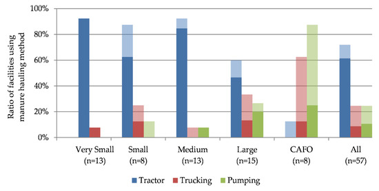 An additional way to reduce traffic from manure transport is to utilize pumping lines for liquid manure rather than tractors or trucks [62]. The survey indicated 25% of the facilities reported using pumping (either permanent or non-permanent) to transport manure, Figure 9, eliminating manure transport via roadways. This was predominantly done at larger and CAFO facilities, potentially due to cost, but also the higher likelihood of handling liquid or slurry manure. While for smaller facilities it is likely not feasible for investment in truck or pumping manure transport methods, large facilities could reduce traffic nuisance by transitioning away from traditional tractor transport to truck or pumping methods.