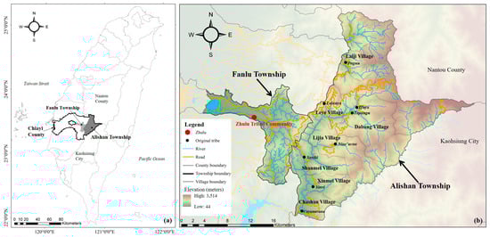 Location of the eight Tsou tribes (located within seven villages) in Ali Mountain and the relocated Zhulu community. (a) The Alishan township and Fanlu Township, Chiayi County. (b) The eight Tsou tribes (located within seven villages) in Ali Mountain and the relocated Zhulu community.
