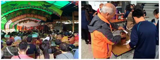Participant observation took place in the tribal market, tribal artistic village, permanent houses, and activity center on occasions such as guided tours, Tsou traditional dance, the culture sharing festival, culture and health station courses for the tribal elders, Zhulu tribe culture co-learning courses for children, and lunar new year tourist activities (Figure 4). Informal interviews were held during the observations. When the researchers participated in activities that were not open to the public, such as courses for residents, they introduced themselves and requested permission before participating and asking questions (informal interviews). While participating in activities open to the public, such as festivals, the researchers did not reveal their identity unless informal interviews were conducted (when researchers verbally revealed the research topic to obtain people’s consent). Observational data were recorded in many forms, including written field notes, photos, and videos. Field notes were made extensively during fieldwork to record what was seen and heard.