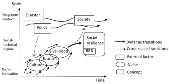 Multi-scale transitions of community-based cultural tourism for post-disaster resilience. Source: Modified from Geels and Schot [49].