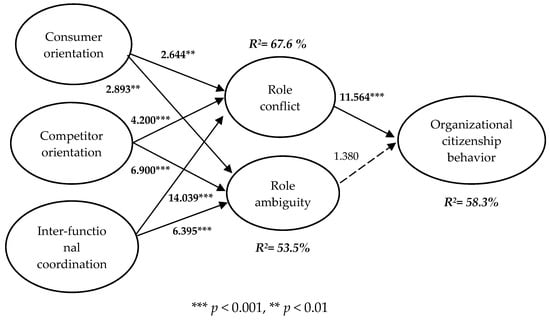Evaluating each item factor loading determines item reliability. Values should have at least 0.6 to indicate high reliability, whereas values under 0.5 should be ignored [65,66]. After performing a statistical analysis, the loadings of all indicators of the consumer orientation, competitor orientation, and inter-functional coordination ranged from 0.74 to 0.91, the role conflict and role ambiguity loading ranged from 0.61 to 0.91, and the loading value of organizational citizenship behavior ranged from 0.78 to 0.84. All of these values were above 0.5, which indicated high reliability and are shown in Table 2.