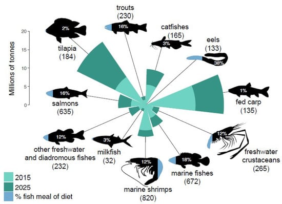 Expected demand for fishmeal in fed-aquaculture diets. The estimated aquafeed volume demand (millions of tons) of the major fed-aquaculture species groups in 2015 and 2025, and the use of fishmeal in the diet of each group in 2015 (represented by the blue portion of each animal). The values (percentage) inside each species group symbol are the estimated fishmeal inclusion in 2015. The values in brackets beside each species group symbol are the estimated volume of fishmeal included in the diets in 2015 (thousands of tons). Copyright 2019, Elsevier. Permission to reproduce requested [61].
