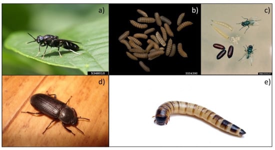 Hermetia illucens (HI) adult (a) and pupae (b) [72,73]. (c) Multiple life stages of Musca domestica [74]. Tenebrio molitor adult (d) and mealworm (e). Permission to reproduce requested [75,76].
