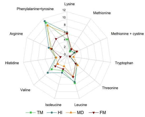 Comparison between the average amino acid profiles of HI, MD (Musca domestica) and TM (Tenebrio molitor), and FM (fishmeal). All the reported values represent averages obtained considering the available literature data as detailed in [82].