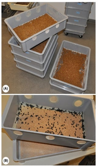 (A) Larvae-growth tray system consisting of stackable boxes with screened bottoms. Once the food has been fully consumed, the frass falls through the bottom screens. (B) Adult rearing system. The top-screened container contains adults, while the bottom tray contains small food particles, frass and early larval instars. Copyright 2016, Elsevier. Permission to reproduce requested [71].