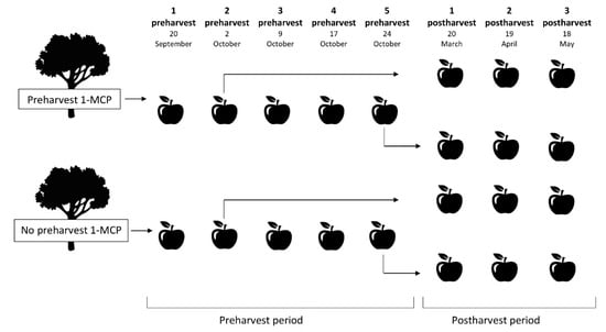 When they were assessed in the preharvest period, the apples were studied to analyze their firmness, total soluble solids (TSS) content, titratable acidity (TA), internal ethylene content (IEC), starch index, and Streif index. When they were assessed in the postharvest period, the apples were studied to analyze their firmness, TSS content, and TA. The IEC, starch index, and Streif index were included only in the preharvest period, as those parameters are typical for this period as they are associated with the maturity of apples [17,18,19].