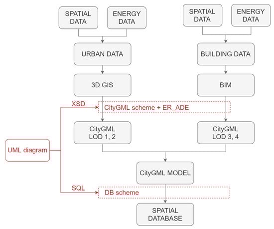 Process flowchart from input data to spatial database. (XSD—XML Schema Definition, ER_ADE—Energy Refurbishment Application Domain Extension, UML—Unified Modelling Language, SQL—Structured Query Language, DB—Database).