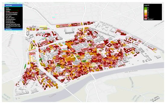 The result was published in the Cesium Ion online platform, where all the data can be visualized after the predisposition of a web app programmed in JavaScript. A screenshot taken from the app is visible in Figure 4. The data analysis made it possible to comprehend the built environment which surrounds the university buildings. The historical center of the city is mainly composed by historical buildings, characterized by low energy performance. According to the CENED database, most of the buildings subjected to energy certification were built during the 19th century, and their behavior could be better than expected, due to the big thermal inertia associated with thick brick walls. Few buildings, heterogeneously distributed, reach high EPC classes, due to recent interventions.
