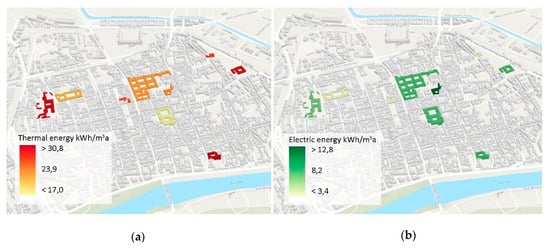 To ensure visibility and data access, a web application was developed making use of the ArcGIS Online platform, provided by ESRI. Some graphic outputs are shown in Figure 5, where thermal and electric energy demands are displayed per heated volumetric unit. The global vision makes it possible to find out where it could pay more to intervene and how. As can be observed from the graphic outputs, in fact, three buildings have the worst energy performance, and there is a building clearly responsible for higher electrical energy consumption.