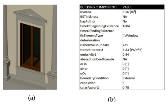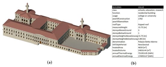 At the subsequent stage, a deeper level of information was associated with single buildings, as is here shown for the Palazzo Botta Adorno (Figure 6a). The complex, built as a noble residence starting from the 18th century and transferred to the University in 1885, is actually under restoration to become a university museum. At this stage, the aim was to organize all the energy-related information already available on the building with the referred geometries, within the relational database, and to design some summary sheets (Figure 6b and Figure 7b). For this application, the required input data are more detailed with respect to the ones seen until now; therefore, it is necessary to involve building information modeling to reach the highest levels of detail provided by CityGML.