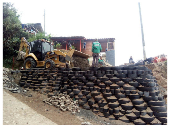 - Loaiza, T. Evaluación del Proceso Constructivo de un Muro de Contención Mediante un Sistema de Refuerzo de Suelo Utilizando Llantas en Desuso; University of Medellín: Medellín, Colombia, 2017. [Google Scholar]