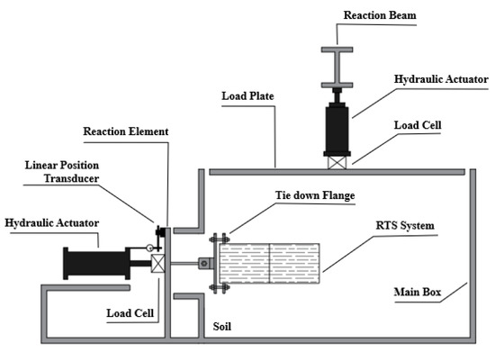 The pullout tests were performed using a loading device consisting of a main box in which the reinforcement elements are placed, the elements are filled with sand, a compression load is applied, and then the element is pulled with an actuator. The pullout tests are schematically shown in Figure 3. The equipment, materials, and test procedure are described in detail below.