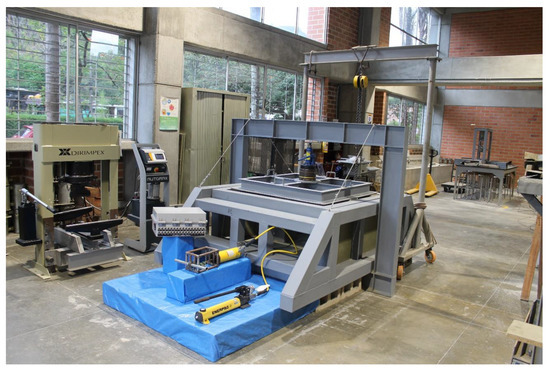 According to the scheme in Figure 3, a system was designed for the execution of real scale tests. The system allows the realization of tests on elements of real size and has a capacity of 200 kN of both normal and shear or pullout load. To generate the normal load, the system has a steel beam (I shape), a steel plate, and a hydraulic jack of 250 kN capacity. For the pullout force, an Enerpac telescopic jack RC256 model of 200 kN capacity and a 180 mm travel was used. For force measurement, two load cells of 250 kN capacity, sensitivity of 24,313 mVdc, and for the measurement of displacements, a linear position transducer with a maximum capacity of 200 mm and an accuracy of 0.001 mm were used. The system has a box or tank with internal dimensions 1.2 × 1.2 × 0.7 m. For the data acquisition, a 24-channel system developed for the laboratory center of the University of Medellín was used. The test system is shown in detail in Figure 3 and Figure 4, with the main components of the system.