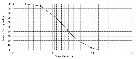 A sand soil that meets the characteristics of fine aggregates for concrete was used in accordance with the Colombian technical specifications and standards. The particle size distribution (standard INV E-213 equivalent to ASTM C 136 - 01) of the material is shown in Figure 5. As observed in Figure 6a,b, the maximum density and optimum moisture content for a compaction test (INV E-141/ASTM D-698 and INV E-142/ASTM D-1557) was 19.71 kPa and 10.20% for the standard effort, and 20,61 kPa and 9.40% for modified effort, respectively. Additionally, a drained direct shear test (INV E-154/ASTM D3080-90) with normal stress ranges between 50 kPa and 200 kPa was executed, obtaining a drained friction angle of 43.0° and an effective cohesion of 8.9 kPa (see Figure 7). Table 2 shows the results of the characterization tests.