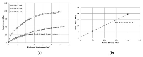 Direct shear test (a) Stress vs. horizontal displacement plot; (b) Shear Stress envelope.