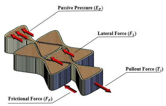 where, FF = Friction force caused by the ground contact on the upper and lower surface of the element; = Passive pressure generated over a unit cross-sectional area, which tends towards a passive condition; = Horizontal components of the lateral reaction forces by contact with neighboring elements.