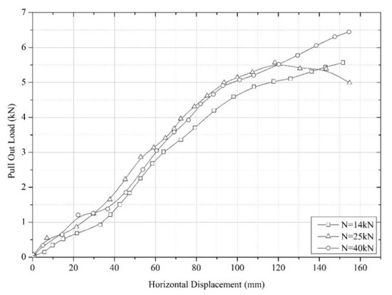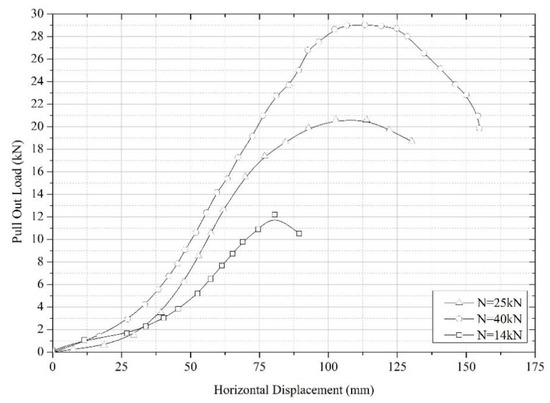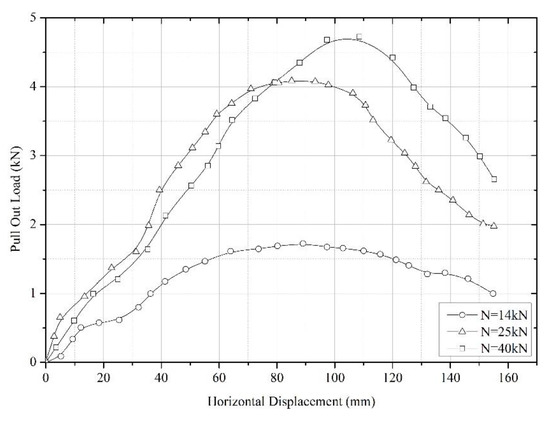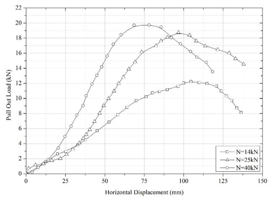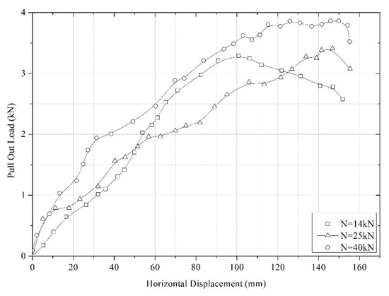 After evaluating the capacity of the individual elements, pullout tests were carried out in two different arrangements. First, a geometric arrangement of six elements was considered, as shown in Figure 8b. The results obtained are observed in Figure 13, which show that there is no substantial increase in the pullout force when the normal load is increased. It can be seen that the pulling force is greater than that of the individual elements with low confinement efforts, but it is lower when the normal force increases. This behavior is due to the fact that the tensioned element is laterally unconfined since it lacks adjacent units that influence the distribution of the pulling force, a fact that leads to a lateral displacement of the element which prevents it from gaining resistance when increased confinement efforts.