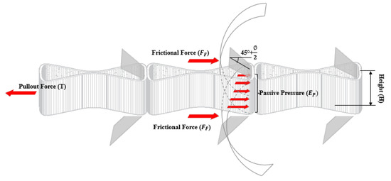 The results obtained in the tests were compared with analytical estimates of the pullout load of the elements, determined from an approach based on the limit equilibrium method described below. As shown in Figure 10, which represents the central elements highlighted in Figure 8b, the pullout load Ti required for the complete mobilization of the reinforcement element depends on the friction of fill and interaction with other elements. Considering the configuration shown in Figure 10 and assuming the elements as rigid bodies, that lateral displacements are restricted by confinement, and principles of statics the pulling load (Ti) can be represented by the following equation: