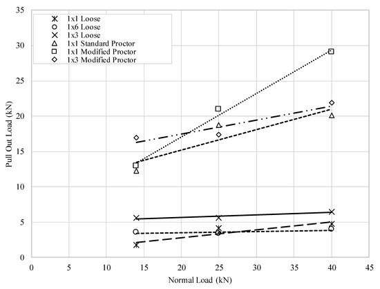 Subsequently, the resistance of a 1 × 3 tire configuration was evaluated, as shown in Figure 8c. In this configuration, the traction element has elements that confine it laterally. With a maximum normal force of 40 kN and loose density in the first campaign, a starting force of 4.07 kN was obtained with a displacement of 176 mm. Under conditions of dense sand, it was 21.84 kN with a displacement of 137 mm. In the second campaign, loose sand condition the maximum load was 6.44 kN with a displacement of 154 mm, but with normal loads of 40 kN, 17.11 kN and 22.19 kN were obtained for standard and modified Proctor, respectively. In this way, it is likely to state that the pullout resistance is influenced by the ability of the sand to expand. This behavior is similar to that reported by [40] for conventional reinforcements placed in dense sands, which is characterized by a configuration of the tires without design arrangements, such as the case under study and joined by polypropylene ropes.
